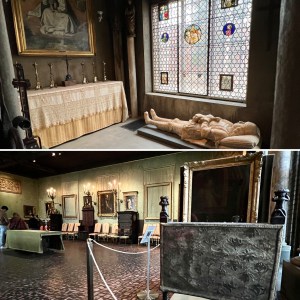 ISG, ever private in her grief, spent the anniversary of Jackie’s death alone. In later years, after it was built, she prayed in the Spanish Chapel. There are stories that the Christ Child in Zurburan’s prominent The Virgin of Mercy, an early acquisition in 1888, resembled her beloved toddler. This Spanish painting portrays the Holy Mother and Son offering a blessing above a garden scene; a theme to which ISG could certainly relate. At her own passing, ISG’s body lay in state just outside this small Chapel (near to her Court gardens) next to, and in the position of the 15th century alabaster figure of a resting knight before being buried between her husband and son at the family tomb at Mount Auburn Cemetery.